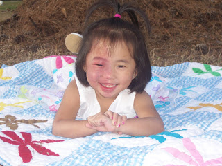 Our sister, Michelle, gave us this dress for Reese when we got home from China. It is a 3T, and we were guessing she'd be able to wear it in the spring. Well, the spring is now, and she sure can. We decided to take Easter portraits today, so we wouldn't be rushed tomorrow. It's rained tons here lately, so we laid down 2 blankets to take the pictures on. The quilt used as a backdrop/ground cover we believe was made by our Granny Edith (our nearly 90 year old great-grandmother), and, impressively, it brought out the colors in her dress quite excellently. She's been wanting to wear that dress since she first saw it. And, yes, I took the pictures. :) I think they turned out wonderfully.